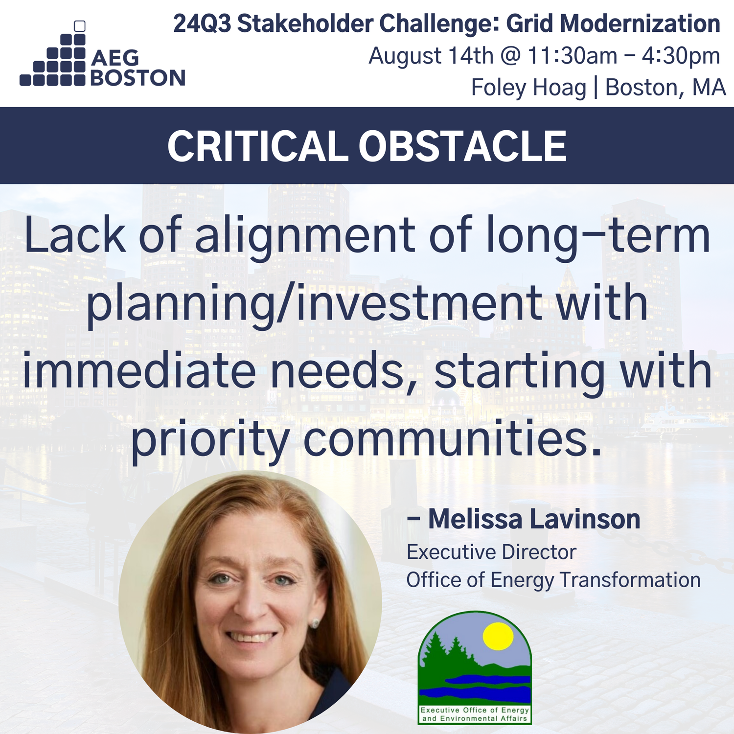 Held on August 14th, 2024 at Foley Hoag offices in Boston, 45 public and private industry leaders convened for the AEG Boston 24Q3 Stakeholder Challenge on Grid Modernization. The purpose of this challenge was to: 1.) Agree on a critical obstacle to equitable grid modernization efforts in Greater Boston to meet climate, health, and energy goals; 2.) Align on a 90-day sprint and 12-month objective to best address this obstacle; and 3.) Enable stakeholders to volunteer as part of a Task Force to deliver the solution.