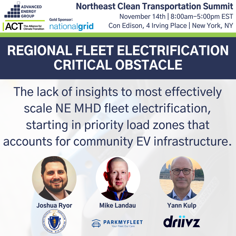 Mike Landau (ParkMyFleet) emphasized the importance of creating a 50-megawatt clean energy hub in the Northeast Corridor to address critical charging infrastructure needs for fleet electrification. Yann Kulp (Driivz) discussed the need for interoperable, multi-purpose community charging networks to break down silos and improve EV adoption. Joshua Ryor (MA EEA)outlined the challenges to medium- and heavy-duty fleet electrification, including cost, grid readiness, and the need for targeted technical expertise.
