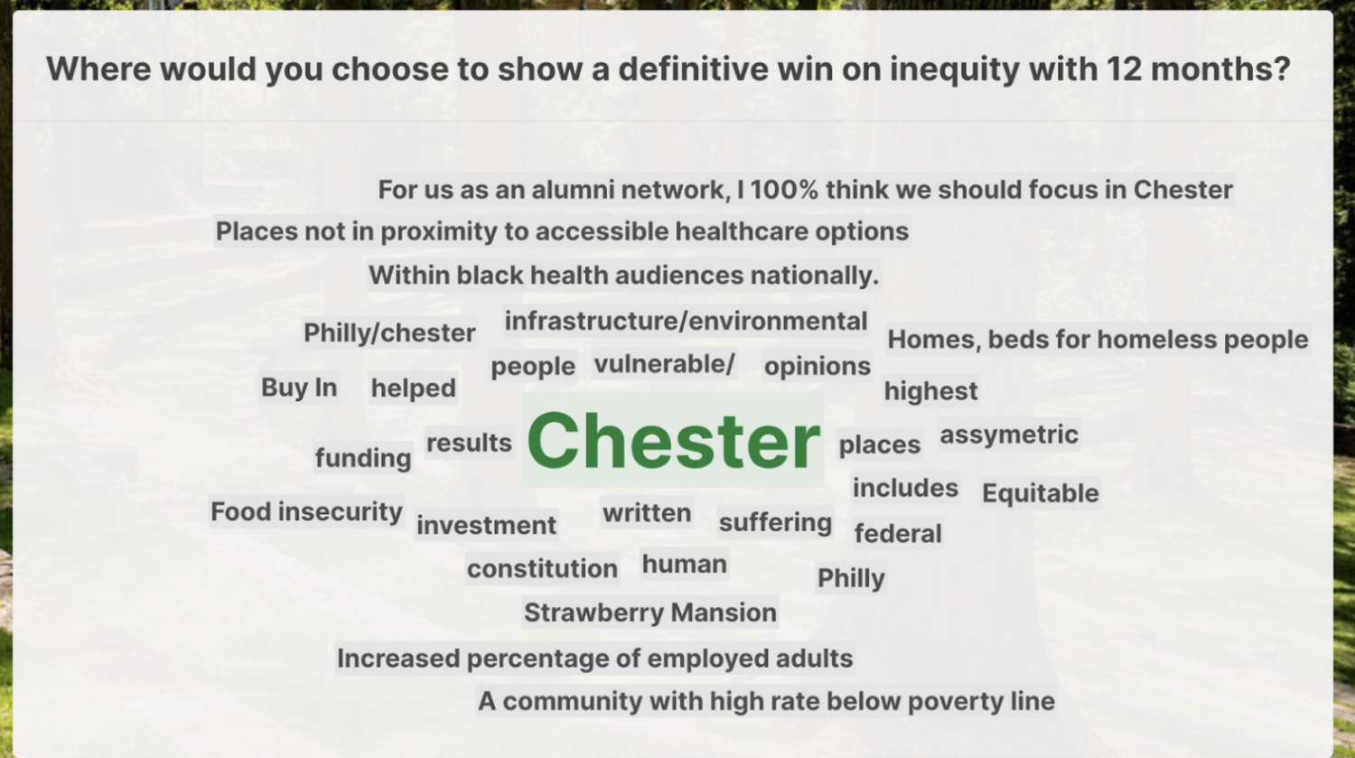 Inequity can be measured and mapped. Inequity is community based. Solving for inequity is a commitment to localized, needed relief validated by those suffering. Which led to our last question. Where would you choose to show a definitive win on inequity within 12 months?